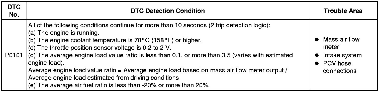 1NZ-FE ENGINE CONTROL: SFI SYSTEM (for Hatchback): P0101: Mass Air Flow Circuit Range / Performance Problem