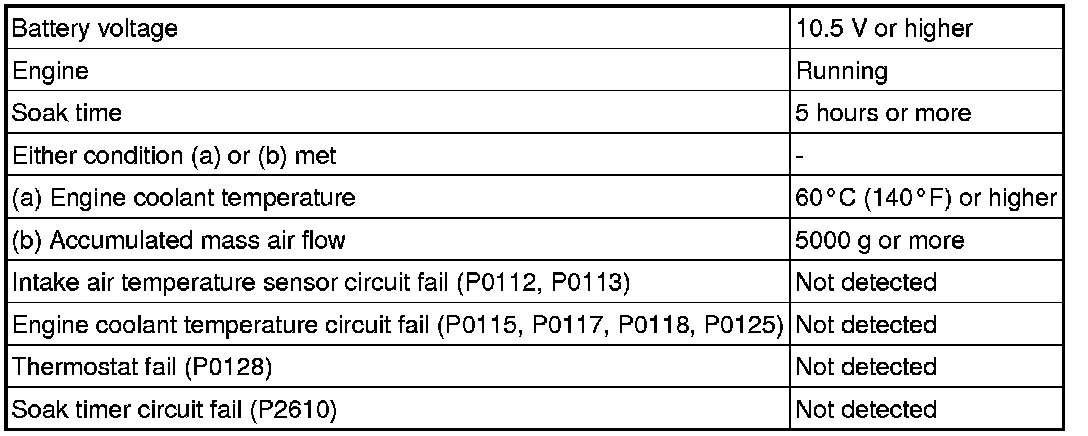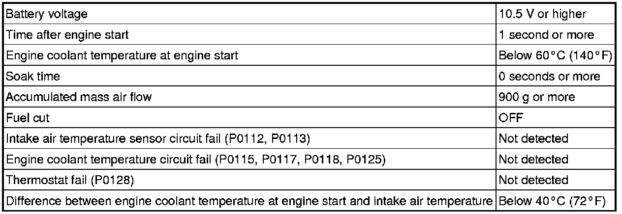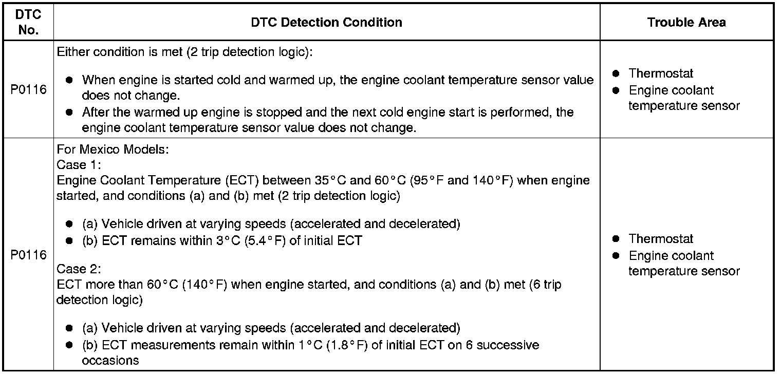 - Upon starting the engine, the ECT is over 60°C (140°F). If after driving at varying speeds (accelerating and decelerating) for a specified period of time, the ECT remains within 1°C (1.8°F) of the starting temperature, the DTC is stored (6 trip detection logic).