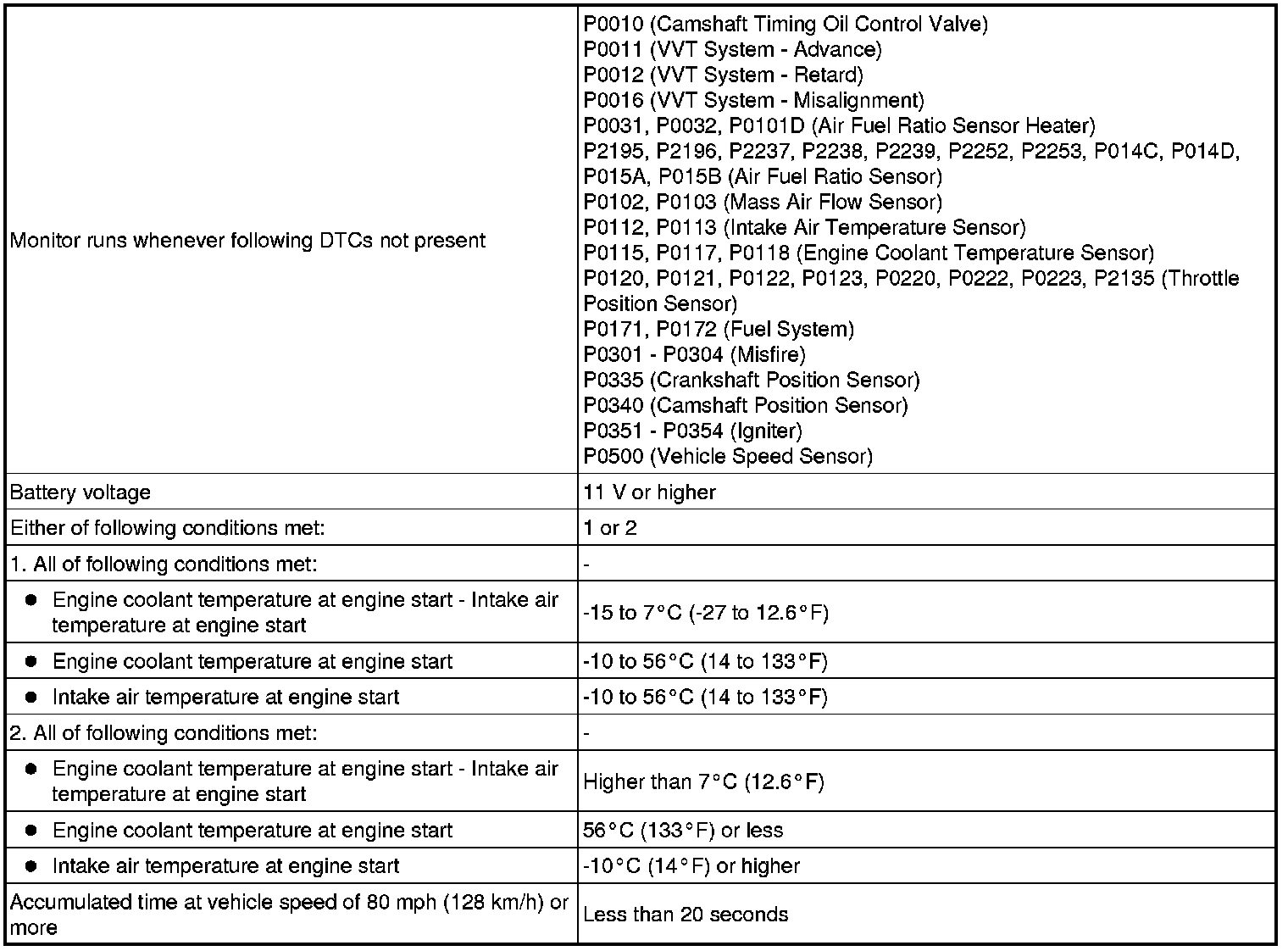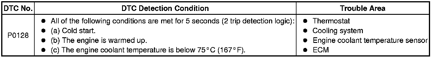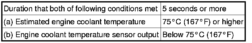This DTC is stored when the engine coolant temperature does not reach 75°C (167°F) despite sufficient engine warm-up time having elapsed.