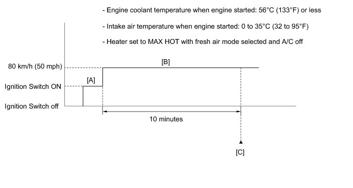 7. Start the engine and drive the vehicle at 80 km/h (50 mph) for 10 minutes [B].