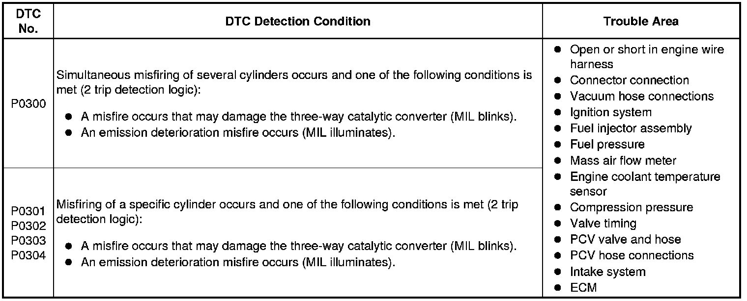 The ECM flashes the MIL and stores a DTC when either one of the following conditions, which could cause damage to the three-way catalytic converter, is detected (2 trip detection logic).