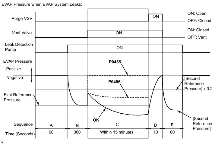 In operation C, the leak detection pump creates negative pressure (vacuum) in the EVAP system and the EVAP system pressure is measured. If the stabilized system pressure is higher than second reference pressure, the ECM determines that the EVAP system has a small leak, illuminates the MIL and stores the DTC (2 trip detection logic).