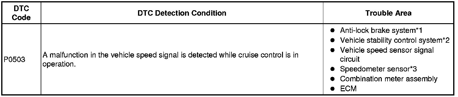 If a malfunction (a rapid change in vehicle speed) in the vehicle speed signal being output from the skid control ECU*1,*2 or speedometer sensor*3 is detected while cruise control is in operation, the ECM determines there to be a momentary interruption or noise and stores a DTC.