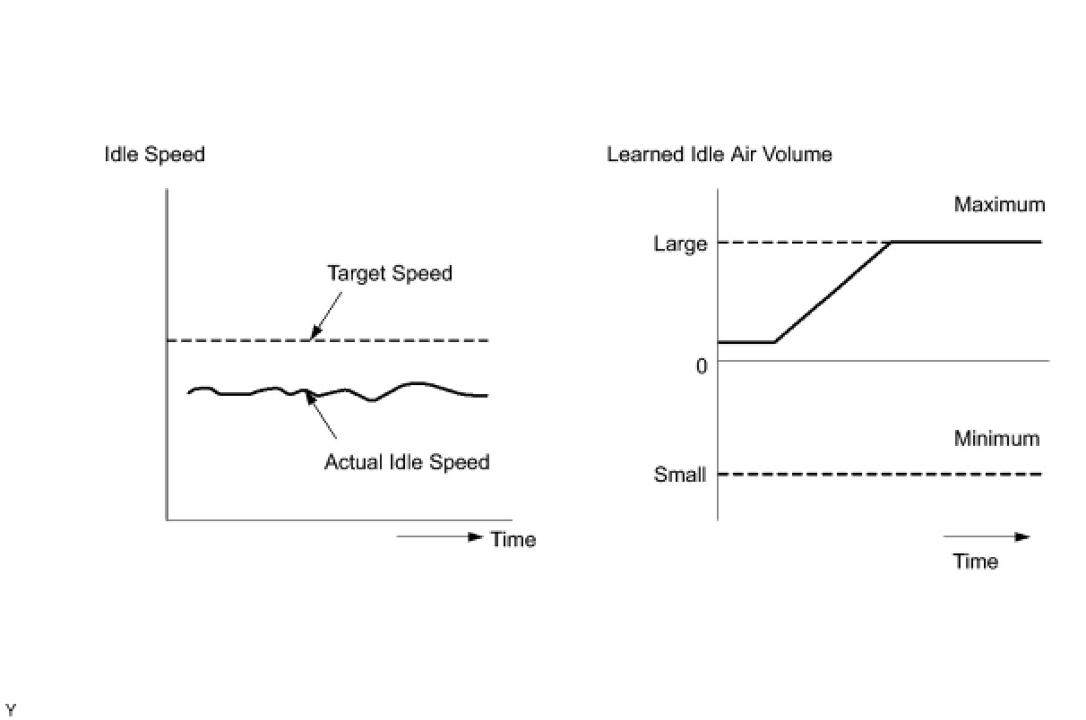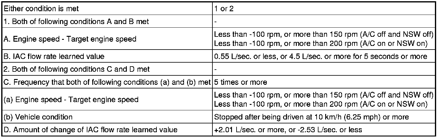 - The difference between the target engine idling speed and actual engine idling speed exceeds the threshold and the IAC flow rate learned value is stuck at the upper or lower limit for 5 seconds or more.