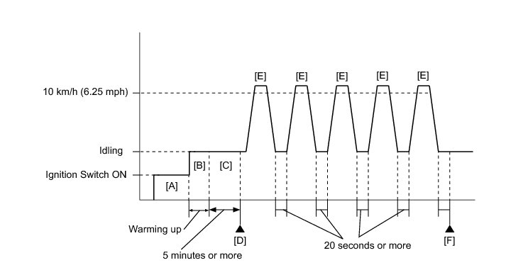 13. Accelerate the vehicle to 10 km/h (6.25 mph) or more, and then idle the engine for 20 seconds or more [E].