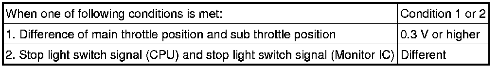 The ECM monitors the input signals of the throttle position sensor No. 1 and stop light switch. As the ECM monitors the input signals of the throttle position sensor No. 1 and the STOP signals of the stop light switch, if the input signals and control signals are deviated, the DTC is stored.
