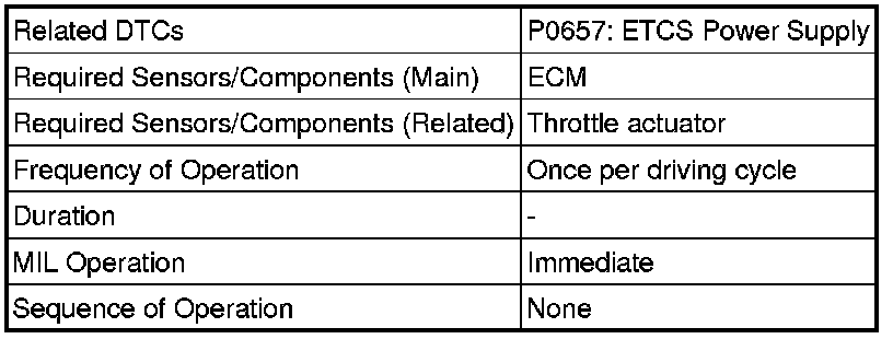 The ECM monitors the output voltage to the throttle actuator. This self-check ensures that the ECM is functioning properly. The output voltage is usually 0 V when the ignition switch is turned off. If the output voltage is higher than 7 V when the ignition switch is turned off, the ECM illuminates the MIL and stores the DTC when the ignition switch is turned to ON.