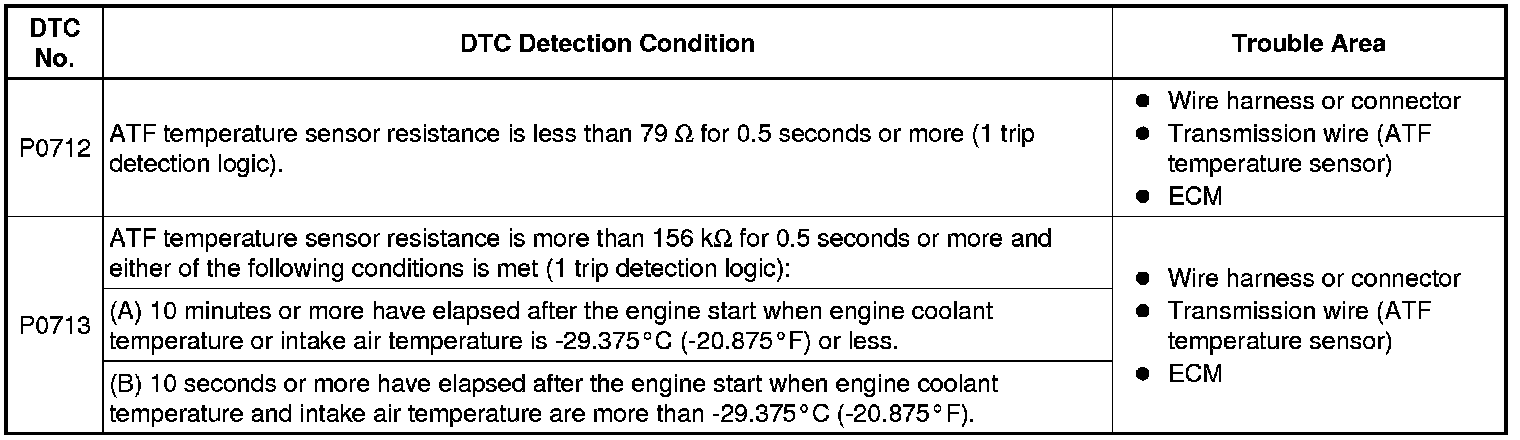 U340E AUTOMATIC TRANSMISSION / TRANSAXLE: AUTOMATIC TRANSAXLE SYSTEM (for Hatchback): P0712, P0713: Transmission Fluid Temperature Sensor "A" Circuit Low Input