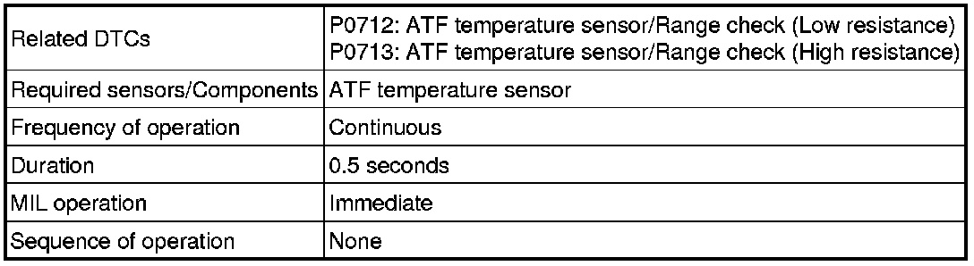 The ATF temperature sensor converts the ATF temperature to an electrical resistance value. Based on the resistance, the ECM determines the ATF temperature and detects opens or shorts in the ATF temperature circuit. If the resistance value of the ATF temperature is less than 79 Ohms*1 or more than 156 kOhms*2, the ECM interprets this as a fault in the ATF sensor or wiring. The ECM turns on the MIL and stores the DTC.