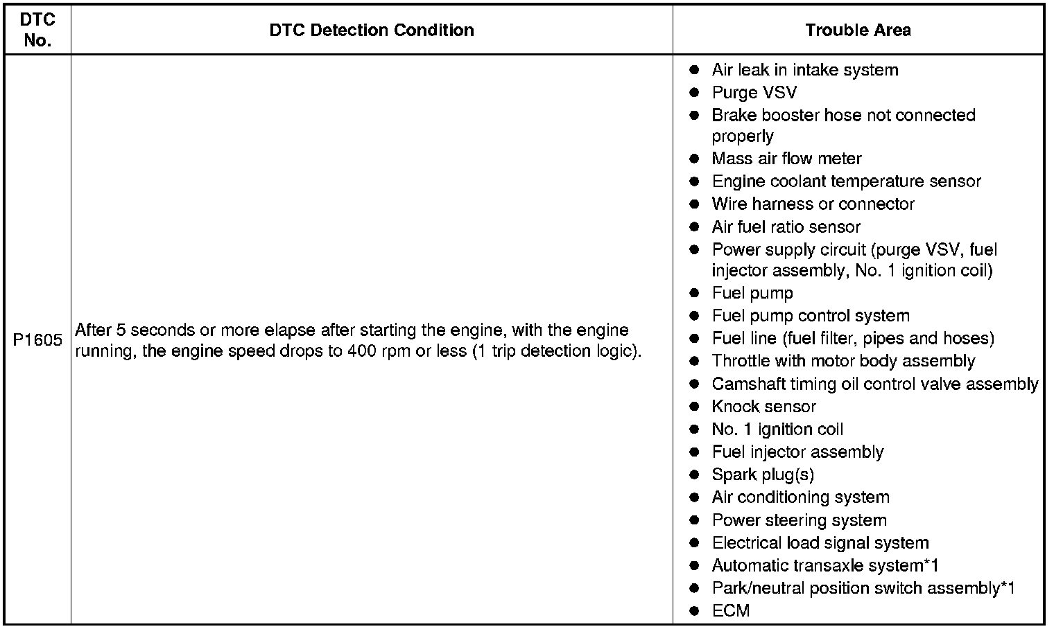 * In contrast to normal malfunction diagnosis for components, circuits and systems, DTCs P1603 and P1605 are used to determine the malfunctioning area from the problem symptoms and freeze frame data when the user mentions problems such as engine stall.