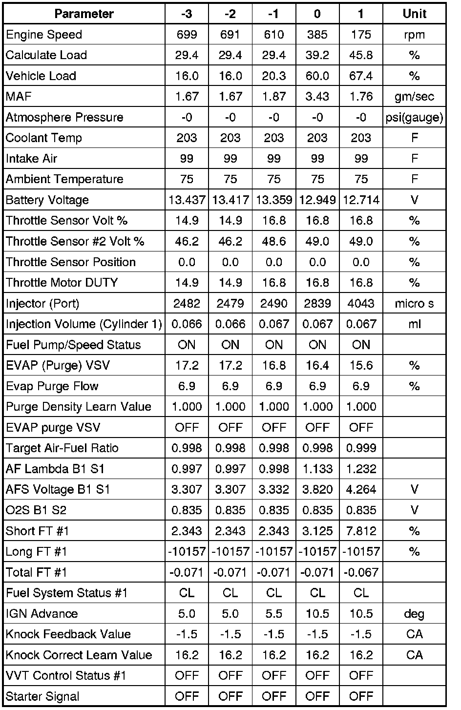 * When confirming the freeze frame data, be sure to check all 5 sets of freeze frame data Freeze Frame Data (from 07/2011).