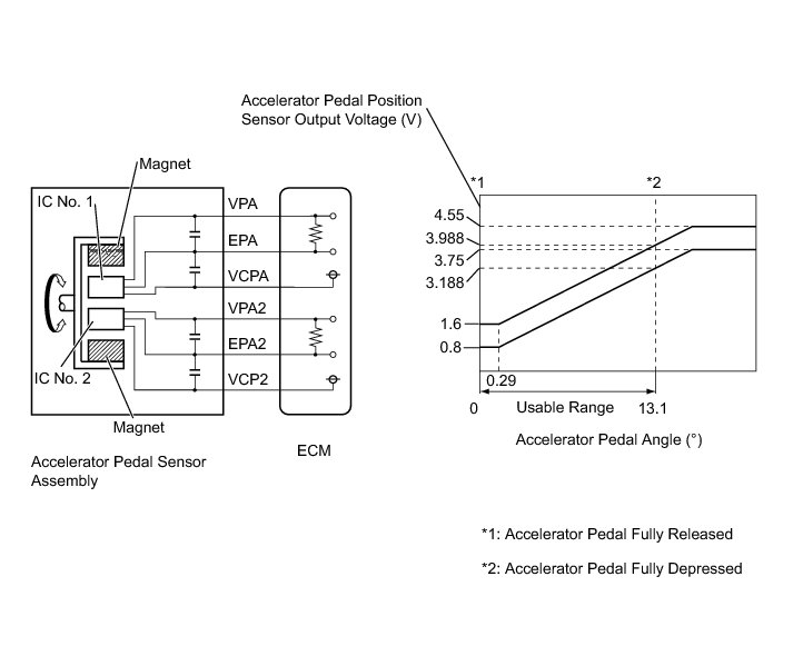 The accelerator pedal position sensor is built into the accelerator pedal assembly and has 2 sensor circuits: VPA (main) and VPA2 (sub). This sensor is a non-contact type sensor and uses Hall-effect elements in order to yield accurate signals even in extreme driving conditions, such as at high speeds as well as very low speeds. The voltage, which is applied to terminals VPA and VPA2 of the ECM, varies between 0.5 V and 4.5 V in proportion to the operating angle of the accelerator pedal (throttle valve). A signal from VPA indicates the actual accelerator pedal opening angle (throttle valve opening angle) and is used for engine control. A signal from VPA2 conveys the status of the VPA circuit and is used to check the accelerator pedal position sensor itself.