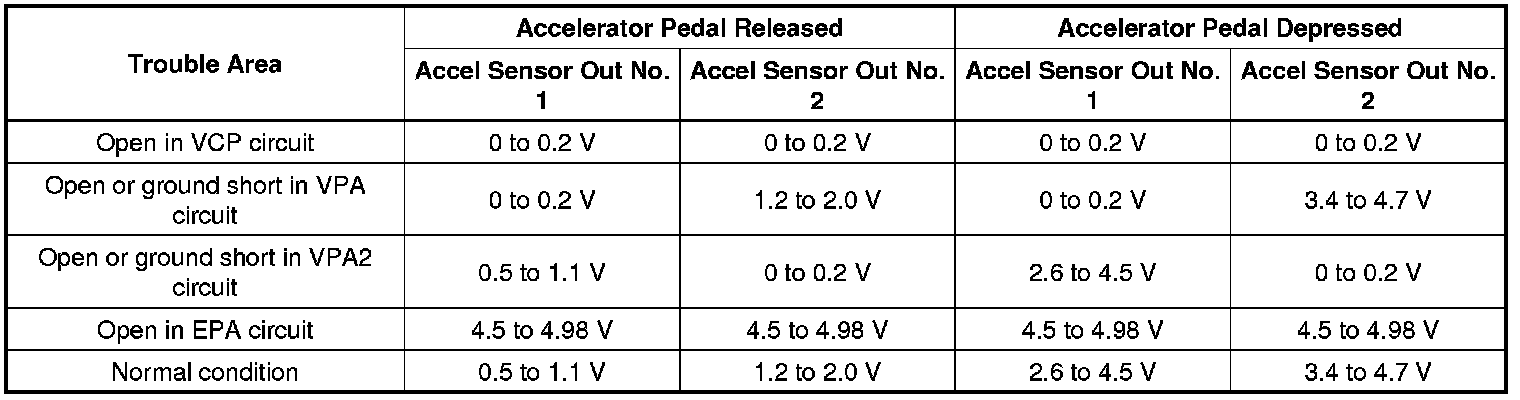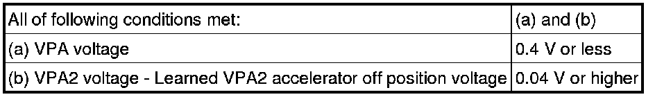 When the output voltage of VPA drops below 0.4 V for more than 0.5 seconds when the accelerator pedal is fully depressed, DTC P2122 is stored.