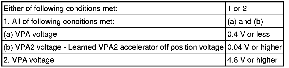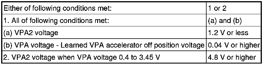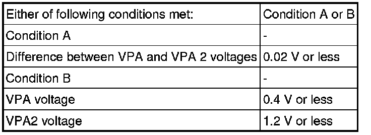 When either output voltage of VPA or VPA2 deviates from the standard range, or the difference between the output voltages of the 2 sensor circuits is less than the threshold, the ECM determines that there is a malfunction in the accelerator pedal position sensor. The ECM then illuminates the MIL and stores a DTC.