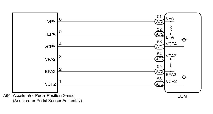 When any of DTCs P2120, P2121, P2122, P2123, P2125, P2127, P2128 and P2138 is stored, the ECM enters fail-safe mode. If either of the 2 sensor circuits malfunctions, the ECM uses the remaining circuit to calculate the accelerator pedal position to allow the vehicle to continue driving. If both of the circuits malfunction, the ECM regards the accelerator pedal as being released. As a result, the throttle valve is closed and the engine idles.