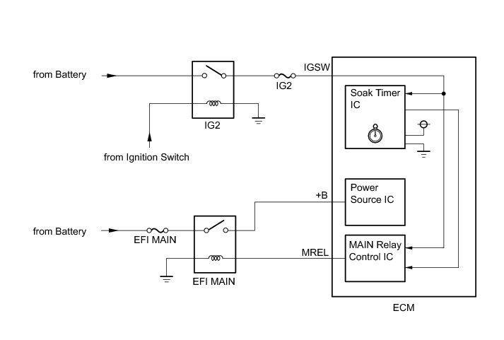 The soak timer operates after the ignition switch is turned off. When a certain amount of time has elapsed after turning the ignition switch off, the soak timer activates the ECM to perform malfunction checks which can only be performed after the engine is stopped. The soak timer is built into the ECM.