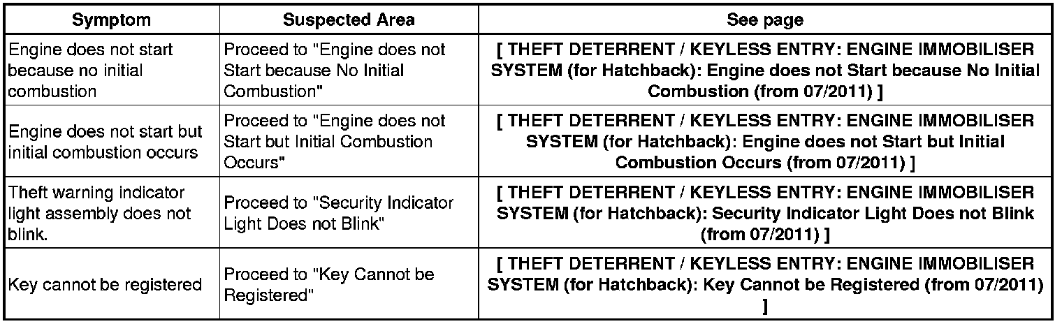 THEFT DETERRENT / KEYLESS ENTRY: ENGINE IMMOBILISER SYSTEM (for Hatchback): PROBLEM SYMPTOMS TABLE