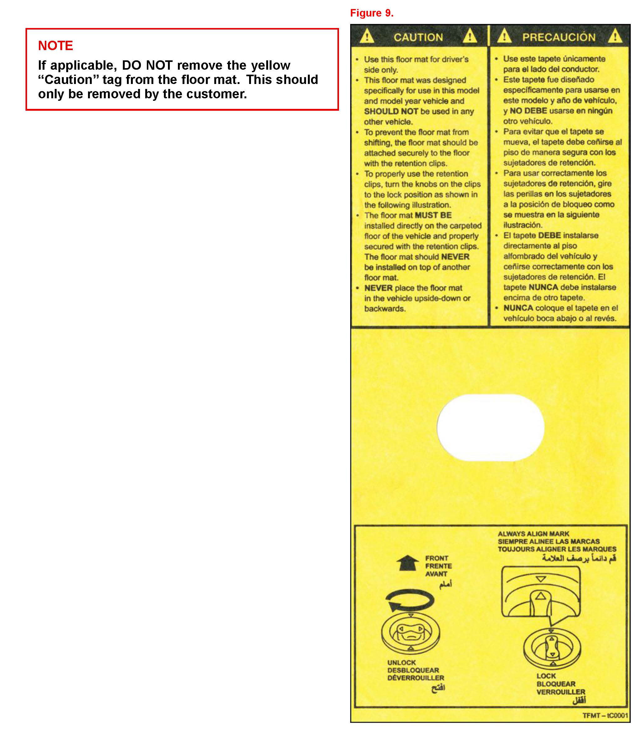 2012 model year vehicles are equipped with driver's side floor mat retaining clips to secure the floor mat in the correct position. In addition, some models may utilize retaining clips for passenger side floor mats as well. Follow the appropriate installation procedure to attach the driver's side and passenger 5 side (if applicable) floor mat to the vehicle carpet using the floor mat retaining clips during Pre-Delivery Service (PDS).