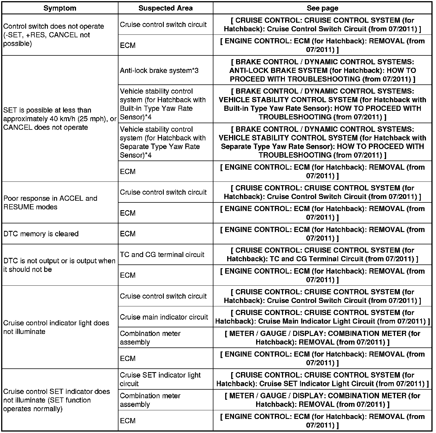 CRUISE CONTROL: CRUISE CONTROL SYSTEM (for Hatchback): PROBLEM SYMPTOMS TABLE