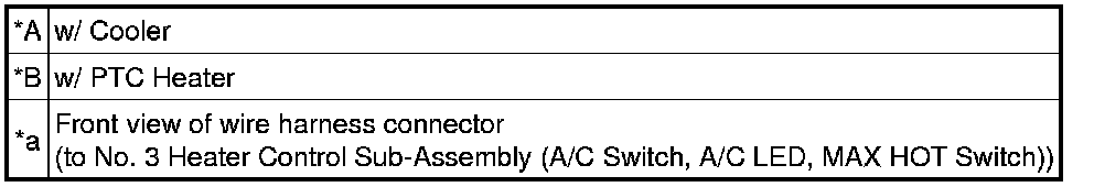 The No. 3 heater control sub-assembly (A/C switch*1, A/C LED*1, MAX HOT switch*2) is powered through the A/C fuse. The No. 3 heater control sub-assembly (A/C switch*1, A/C LED*1, MAX HOT switch*2) transmits operational signals of each switch to the air conditioning amplifier assembly.