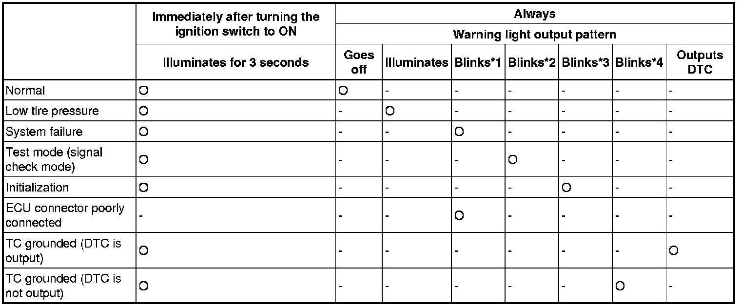 The table below indicates the state of the tire pressure warning light after the ignition switch is turned to ON.