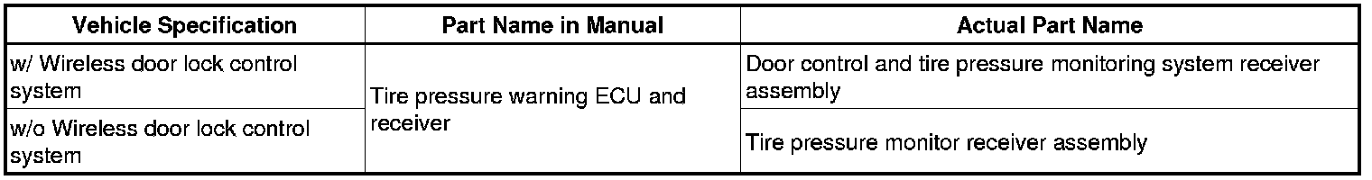 The type of tire pressure warning ECU and receiver used on this model differs according to the specifications of the vehicles. The expressions listed in the table below are used in this section.