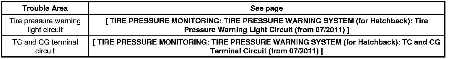 * If the tire pressure warning light does not indicate any DTCs or the normal system code, inspect the tire pressure warning light circuit or TC and CG terminal circuit.