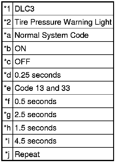 (d) Read and record any DTCs from the tire pressure warning light on the combination meter assembly. Refer to the illustration for examples of a normal system code and codes 13 and 33.