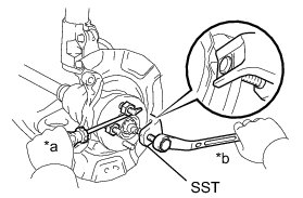 (a) Using SST and a screwdriver or the equivalent to hold the axle hub, remove the hub bolt.
