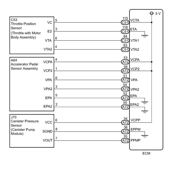 The ECM constantly generates 5 V power from the battery voltages supplied to the +B (BATT) terminal to operate the microprocessor. The ECM also provides this power to the sensors through the VC output circuit.