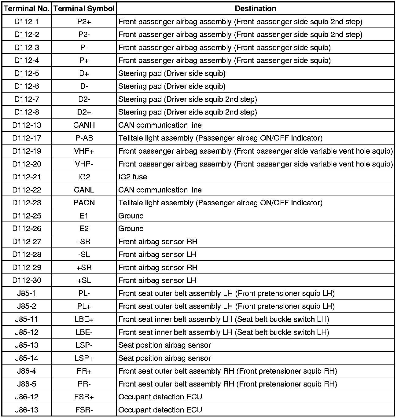 SUPPLEMENTAL RESTRAINT SYSTEMS: AIRBAG SYSTEM (for Hatchback without VSC): TERMINALS OF ECU