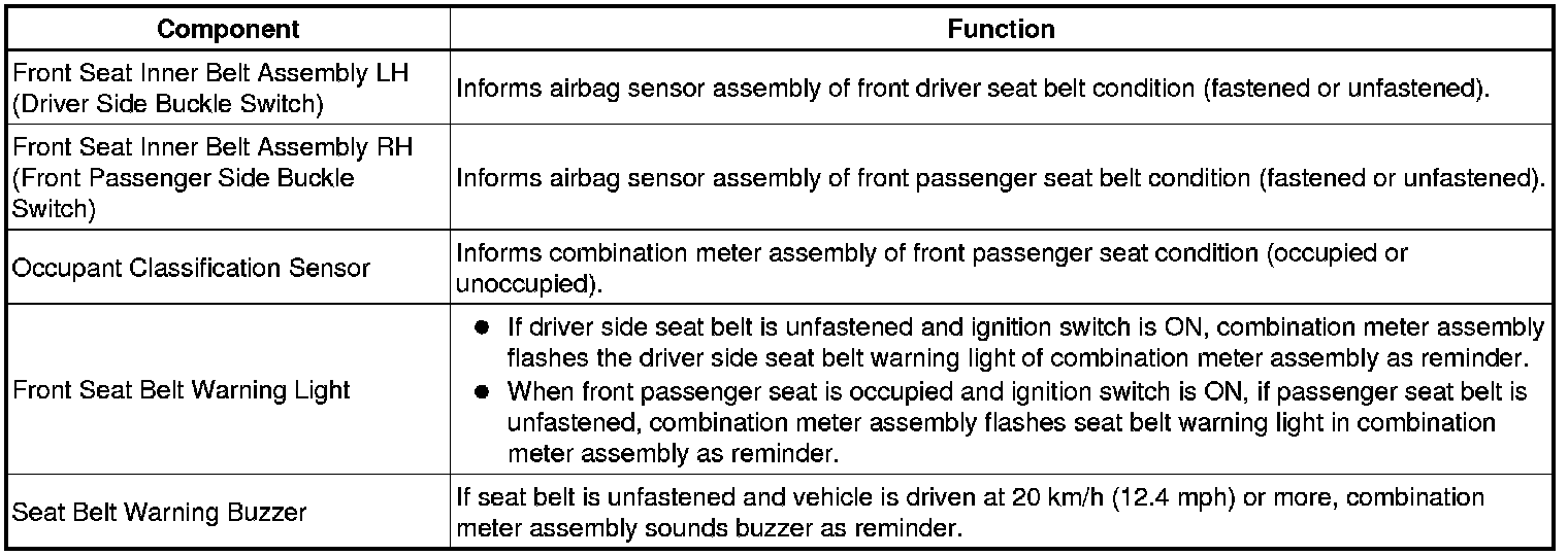 SEAT BELT: SEAT BELT WARNING SYSTEM (for Hatchback): SYSTEM DESCRIPTION