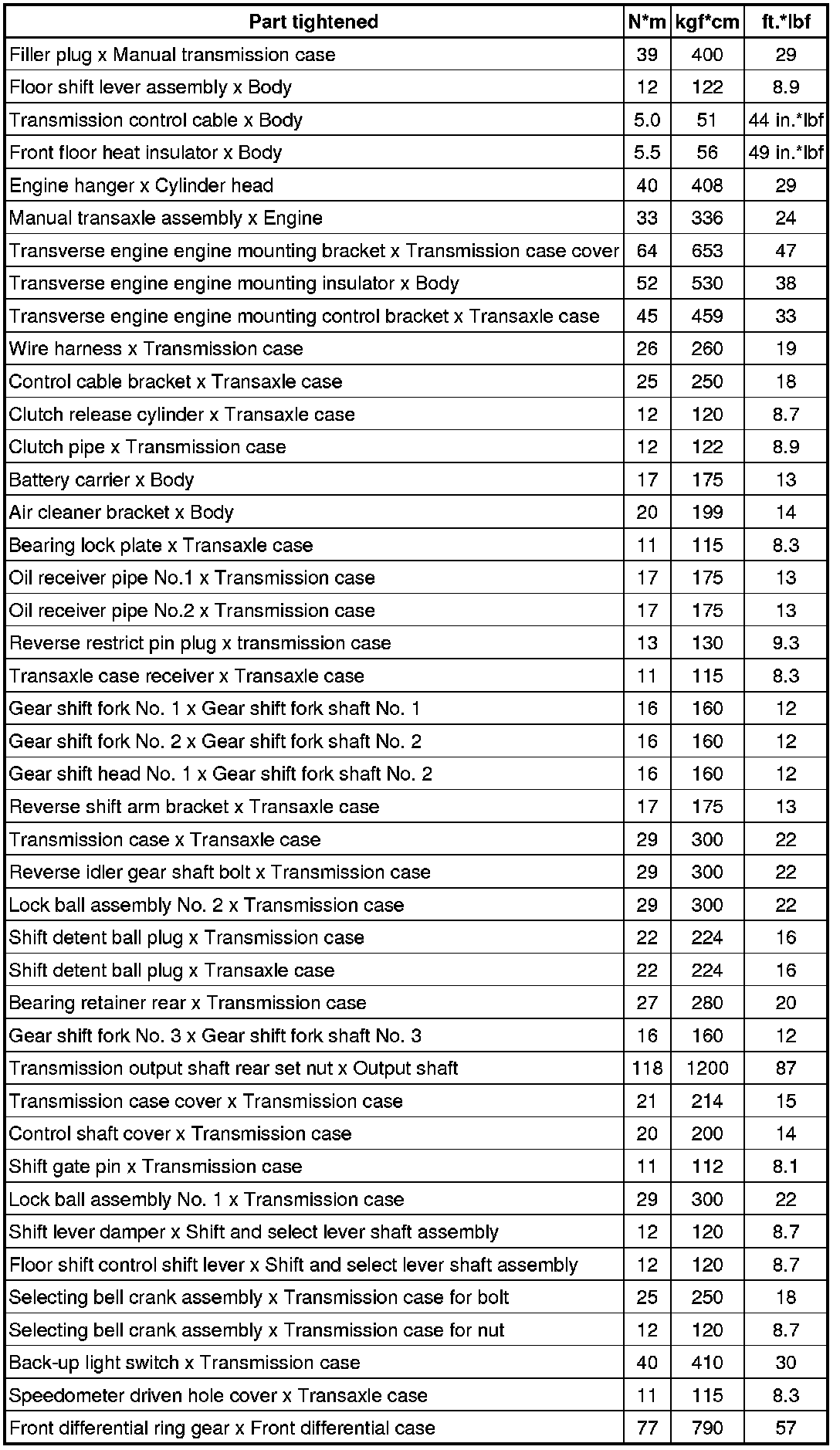 SPECIFICATIONS: C50 MANUAL TRANSMISSION / TRANSAXLE (for Hatchback): TORQUE SPECIFICATIONS