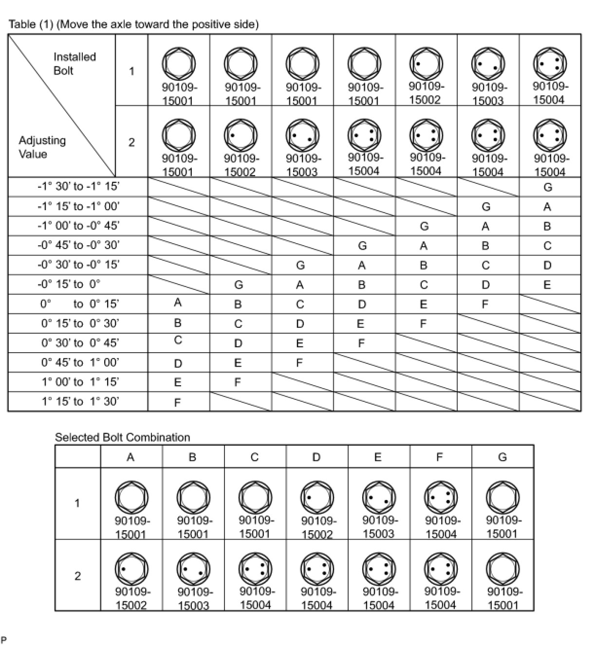 Check the combination of installed bolts. Select appropriate bolts from the table below to adjust the camber to within the specified range.