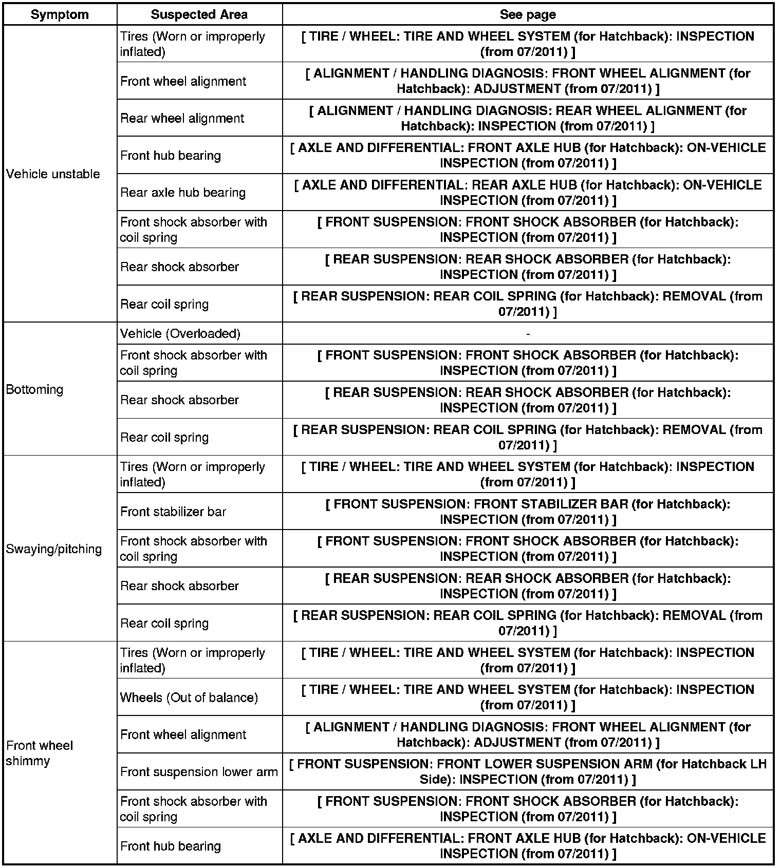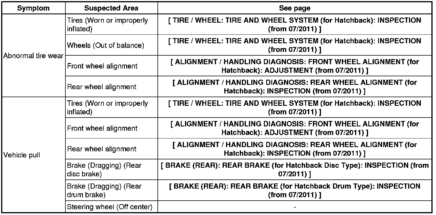 FRONT SUSPENSION: FRONT SUSPENSION SYSTEM (for Hatchback): PROBLEM SYMPTOMS TABLE