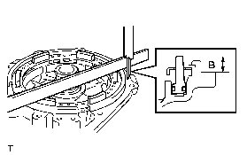 (b) As shown in the illustration, place a straightedge on the 2nd coast and overdrive brake piston and measure the distance between the rear transaxle cover and straightedge using a vernier caliper. (Dimension B)