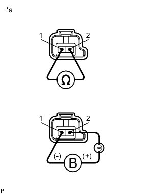 (b) Connect the positive (+) battery lead with a 21 W bulb to terminal 2 and the negative (-) battery lead to terminal 1 of the solenoid valve connector, and check the operation of the valve.
