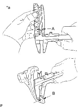(c) Using a vernier caliper, measure the width of the reverse gear groove (A) and the thickness of the claw part on the reverse shift fork (B), and calculate the clearance.