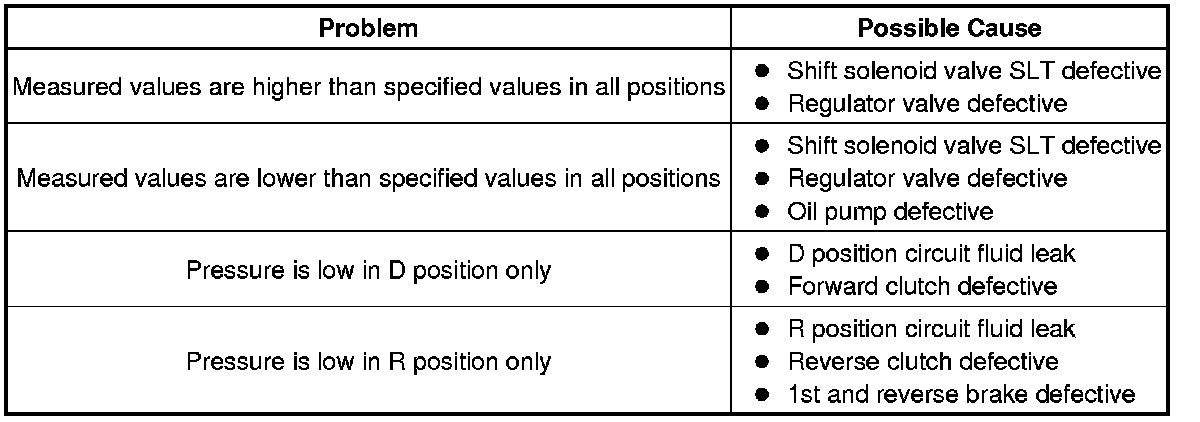 * Perform the test at the normal operating ATF (Automatic Transmission Fluid) temperature 50° to 80°C (122° to 176°F).