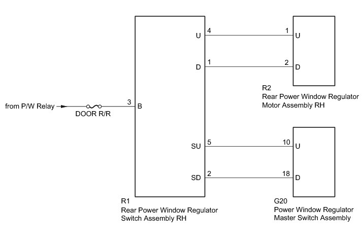 If the rear RH side manual UP / DOWN function does not operate, a malfunction may exist in the rear power window regulator motor assembly RH, rear power window regulator switch assembly RH, power window regulator master switch assembly or wire harness.