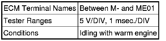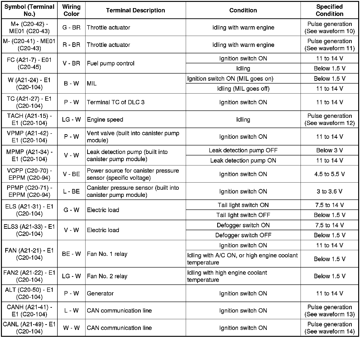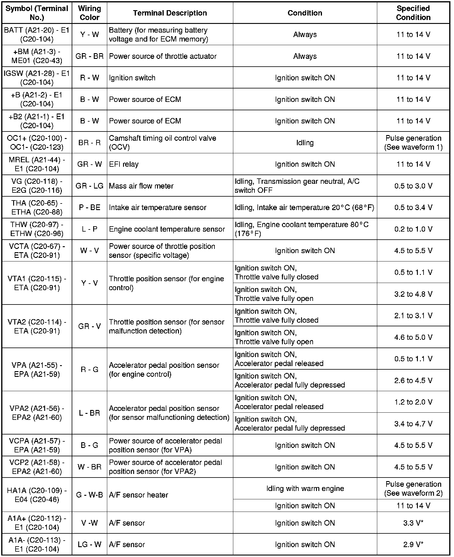 The standard normal voltage between each pair of ECM terminals is shown in the table below. The appropriate conditions for checking each pair of terminals are also indicated. The result of checks should be compared with the standard normal voltage for that pair of terminals, displayed in the Specified Condition column. The illustration above can be used as a reference to identify the ECM terminal locations.