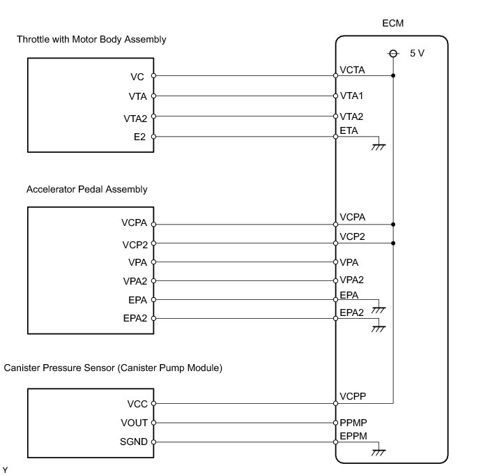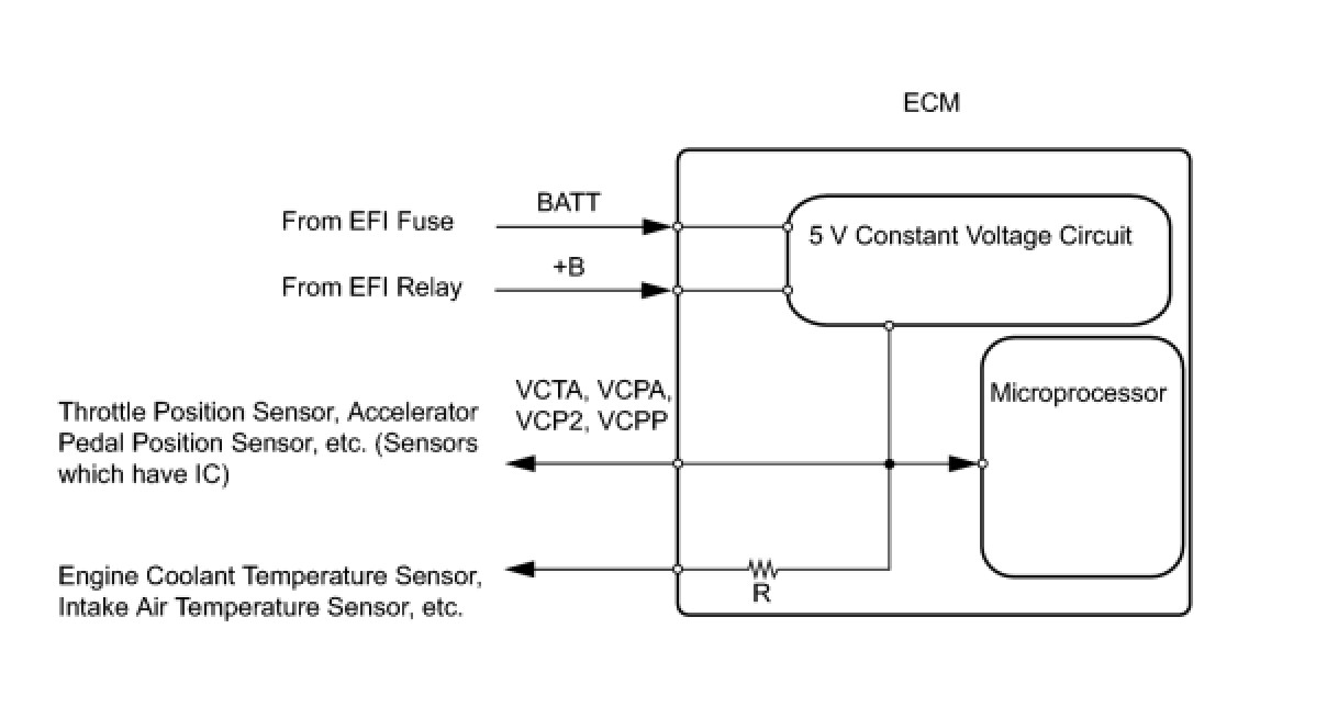 The ECM constantly generates 5 V power from the battery voltages supplied to the +B (BATT) terminal to operate the microprocessor. The ECM also provides this power to the sensors through the VC output circuit.