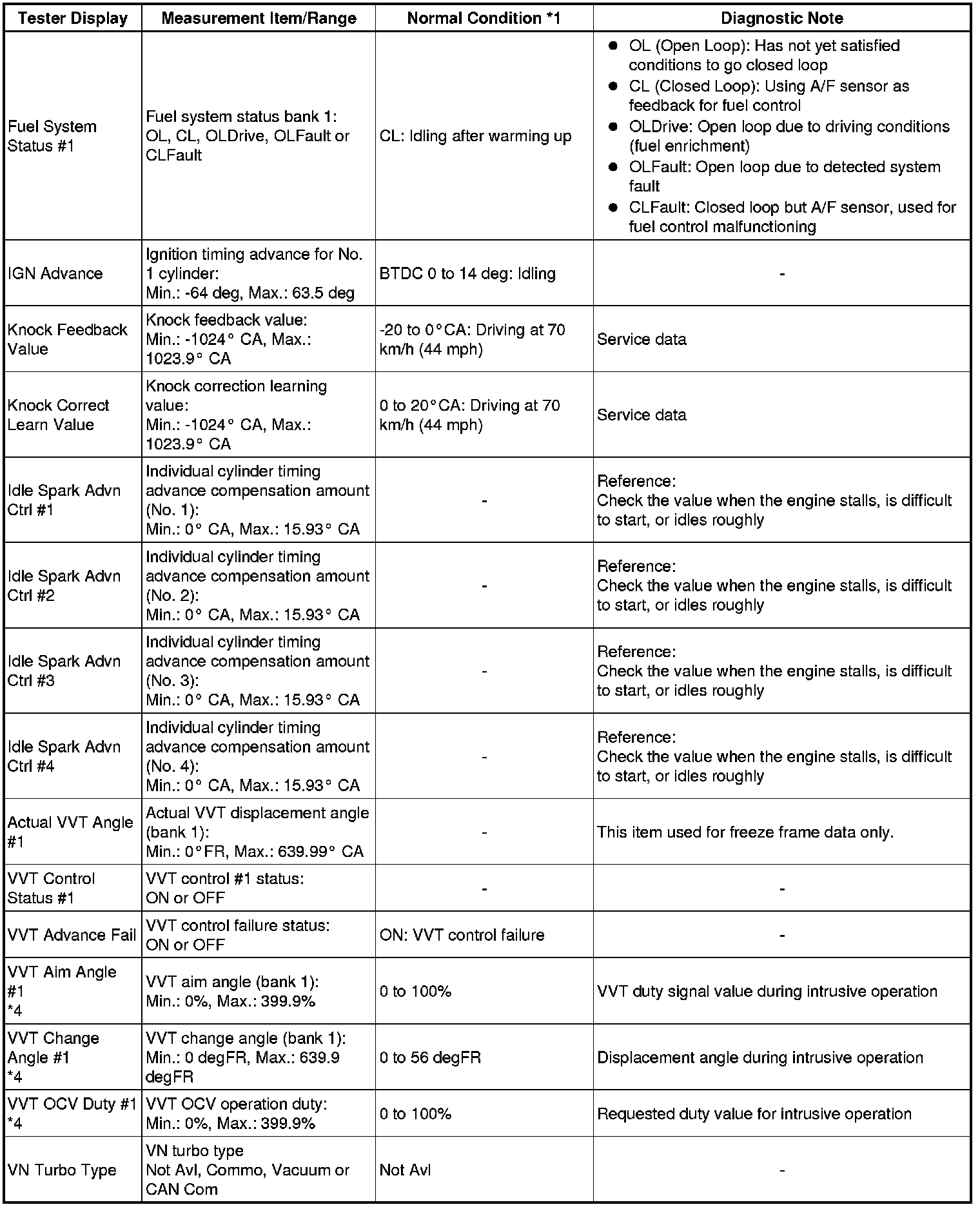 * *4: Data List values are only displayed when performing the following Active Tests: Control the VVT Linear (Bank1), and Control the VVT System (Bank1). For other Active Tests, the Data List value will be 0.