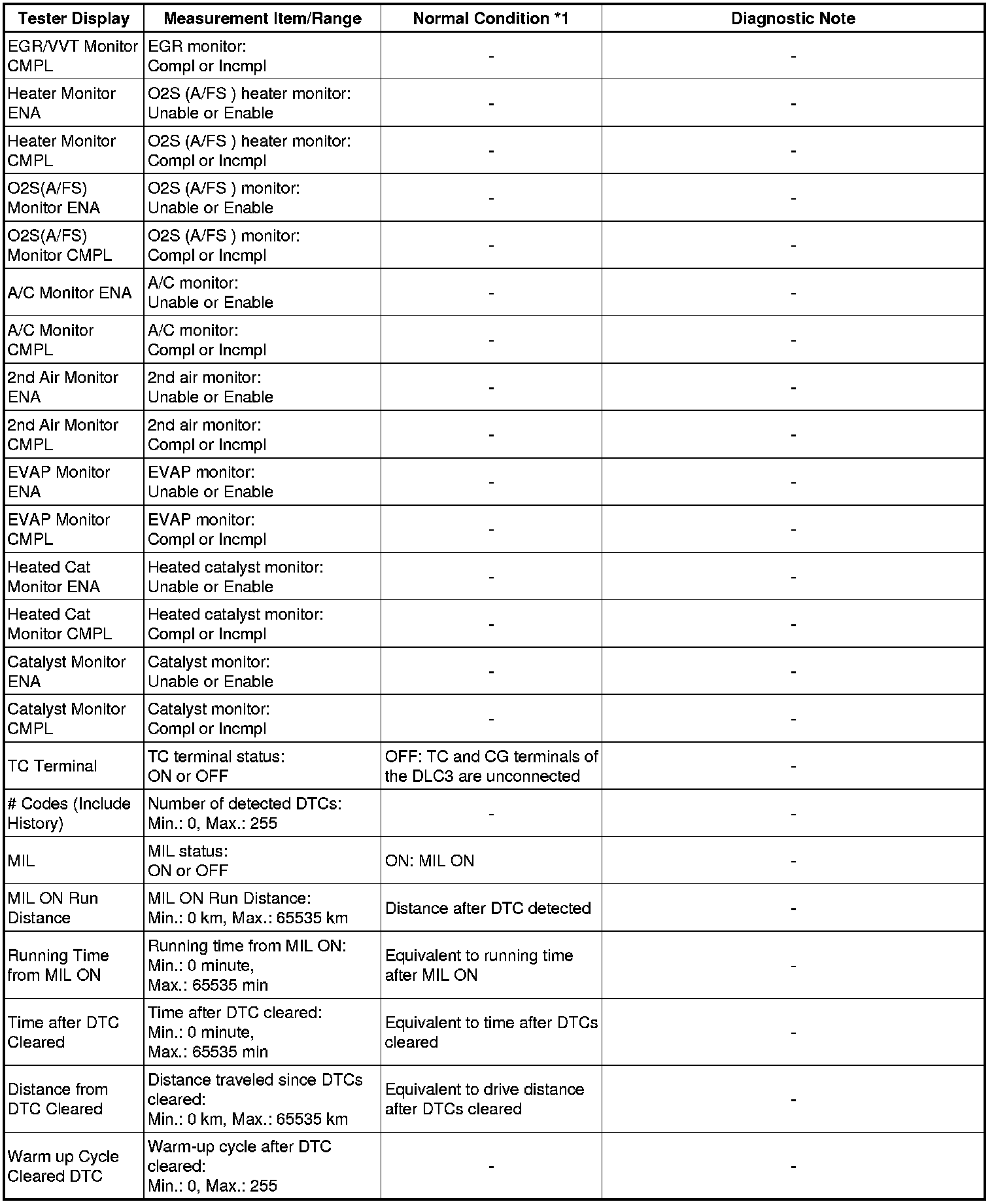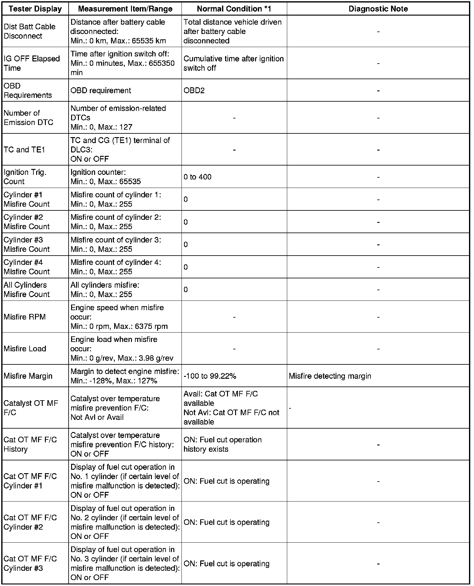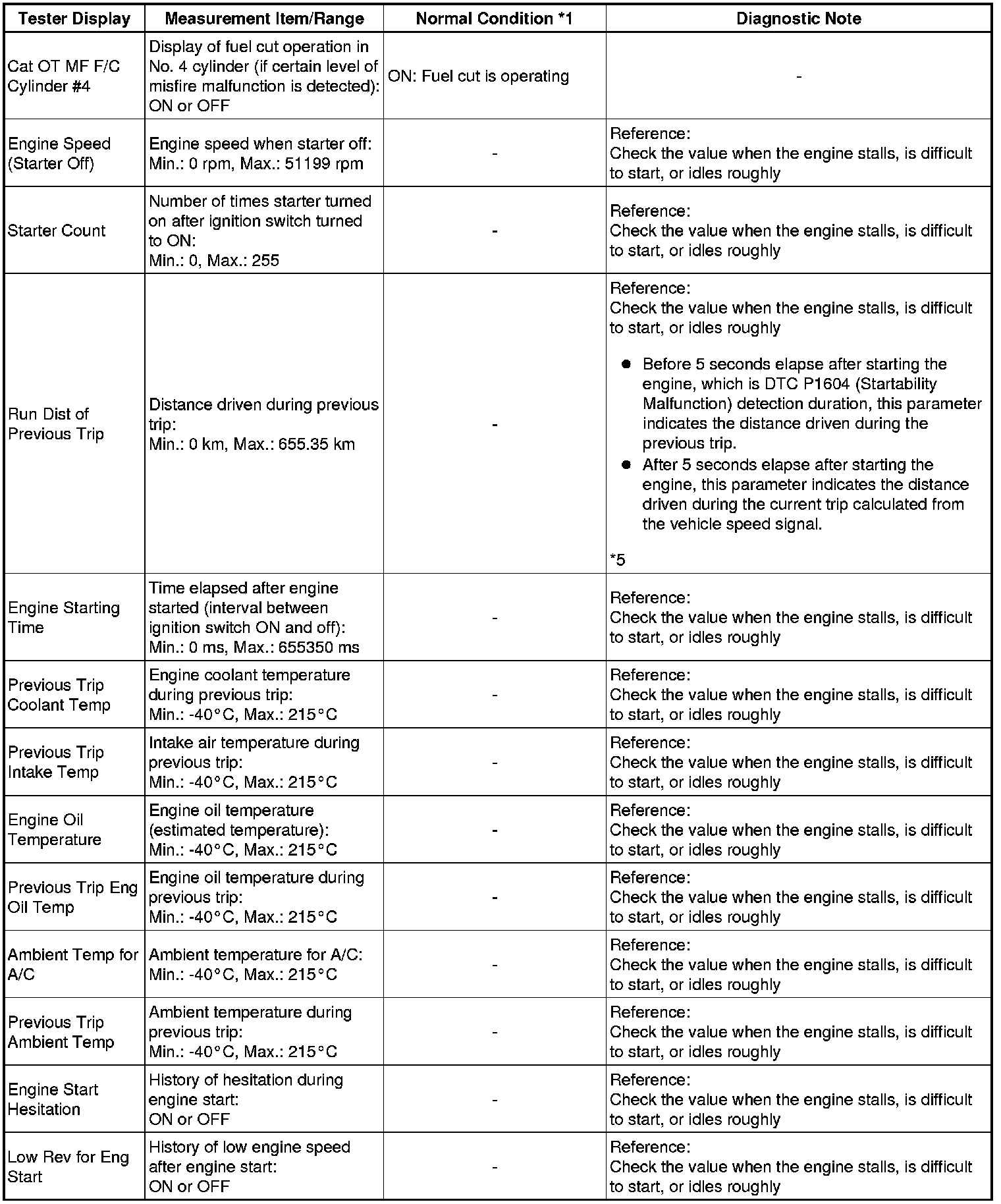 * *5: Run Dist of Previous Trip in freeze frame data which were present when the startability malfunction occurred (DTC P1604 detected) indicates the distance driven during the previous trip, but in all other cases, such as for the snapshot data of Data List (real-time measurements), or for freeze frame data which were present when the DTCs other than P1604 were detected, the value indicates the distance driven during the current trip.