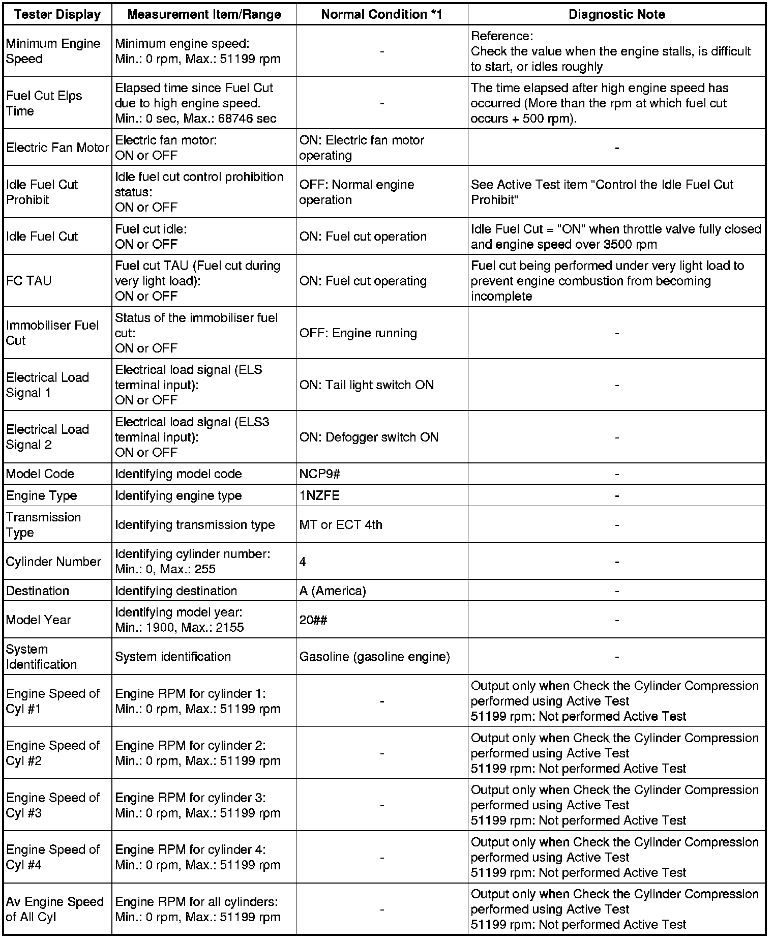 At first, the Techstream displays extremely high cylinder engine speed values. After approximately 10 seconds of engine cranking, each cylinder engine speed measurement will change to the actual engine speed.