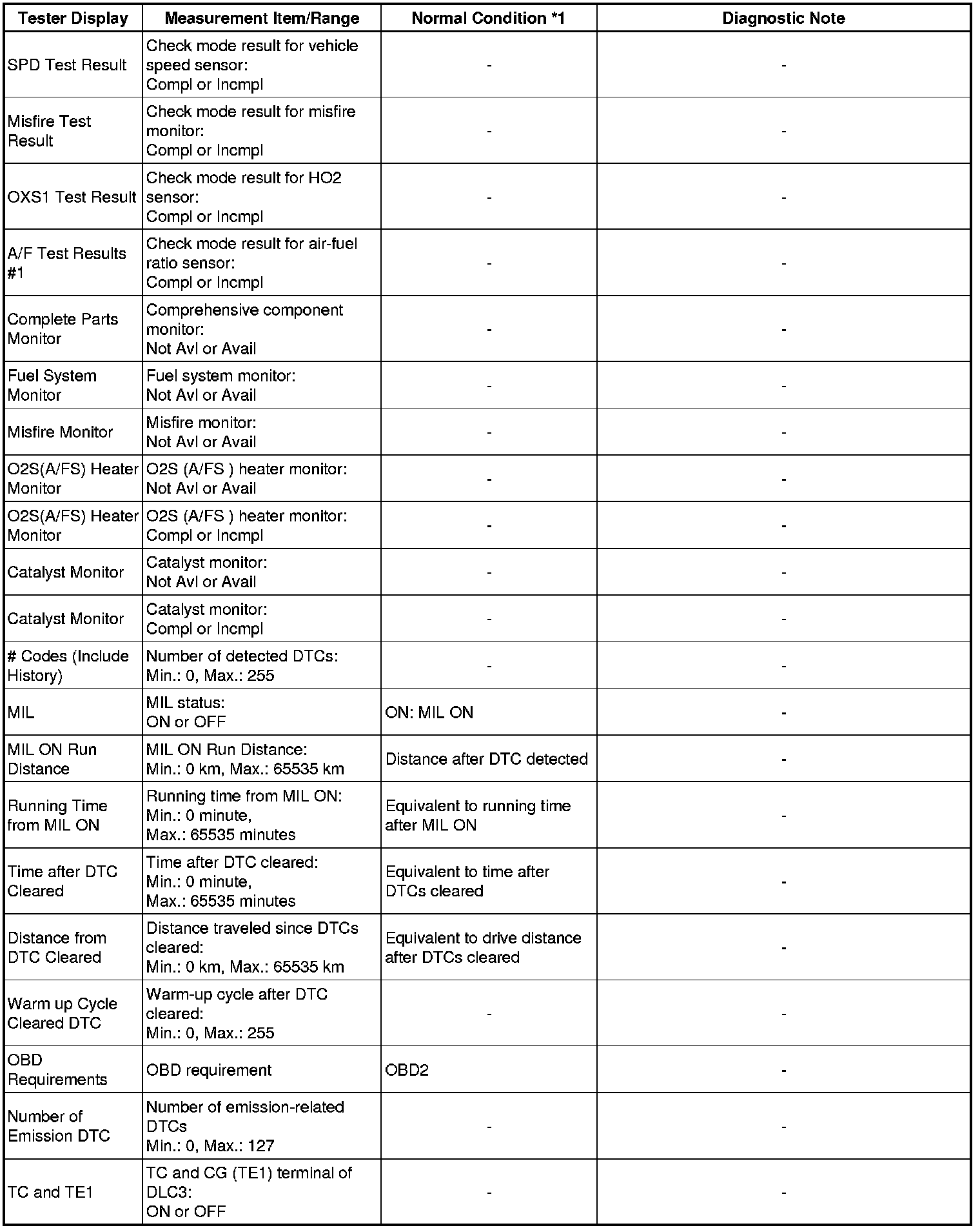 In the table below, the values listed under Normal Condition are for reference only. Do not depend solely on these values when determining whether or not a part is faulty.