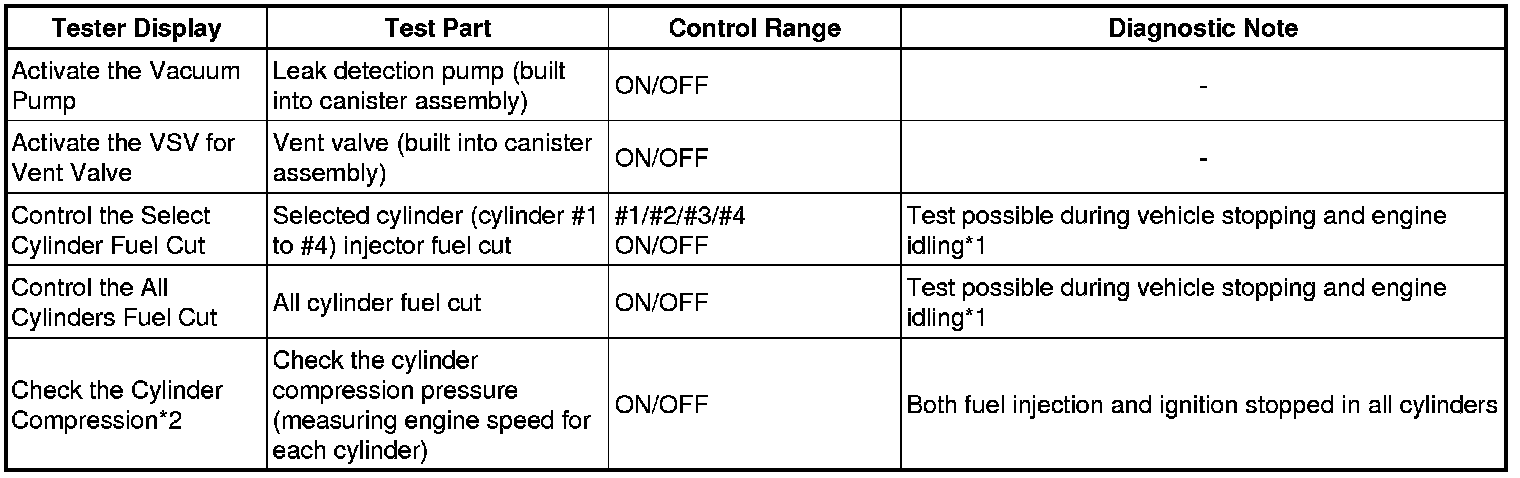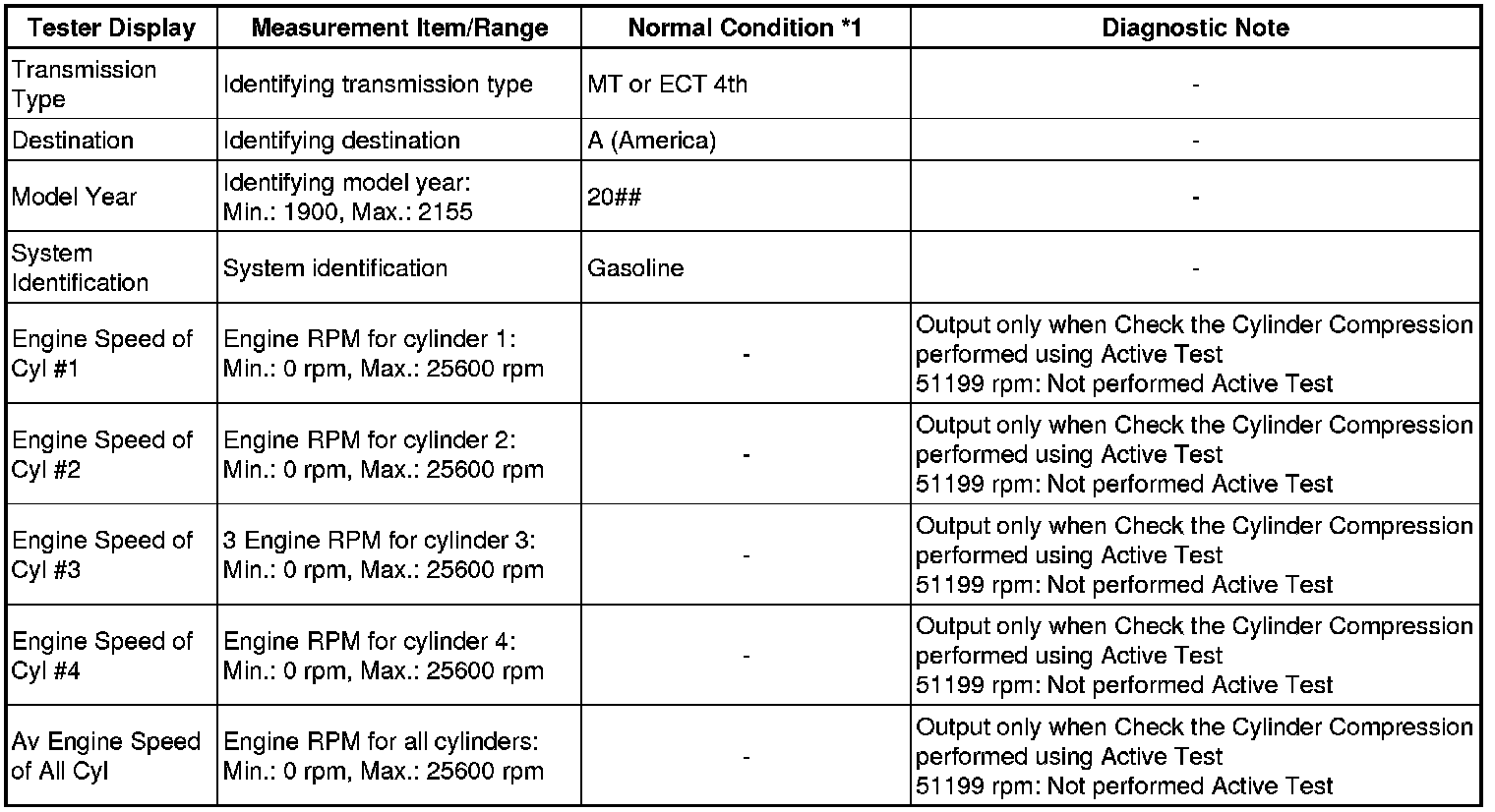 *2: In this Active Test, the fuel and ignition of all cylinders is cut. The engine must then be cranked for approximately 10 seconds. At this time, the speed of each cylinder is measured. If the speed of one cylinder is more than the other cylinders, it can be determined that the compression pressure of that cylinder is lower than the other cylinders.
