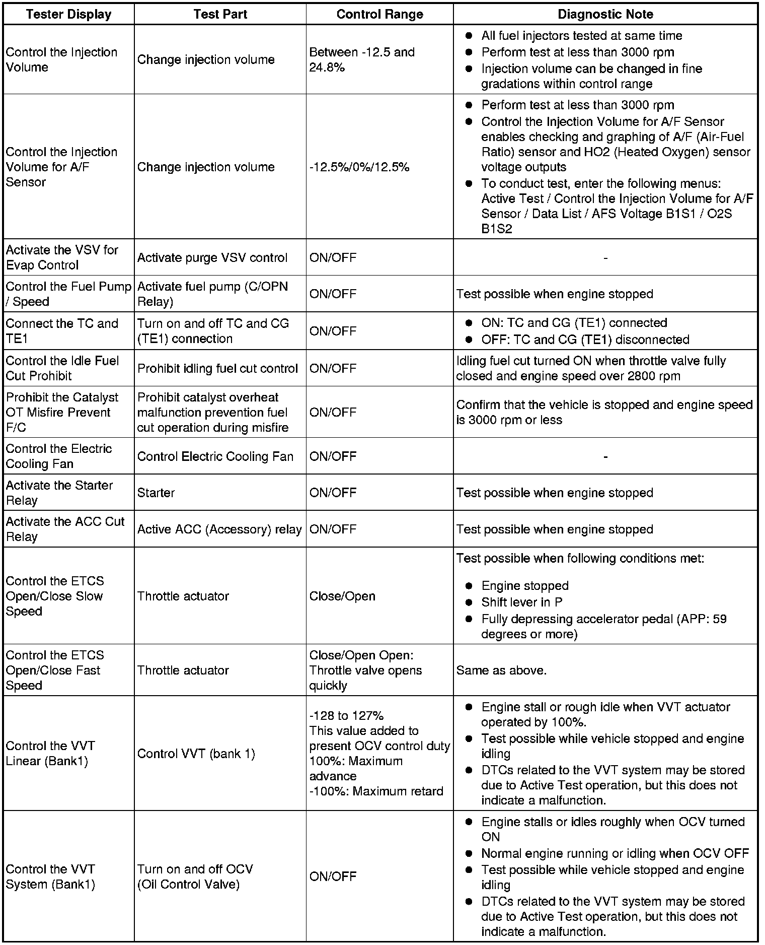 (e) Perform the Active Test by referring to the table below.