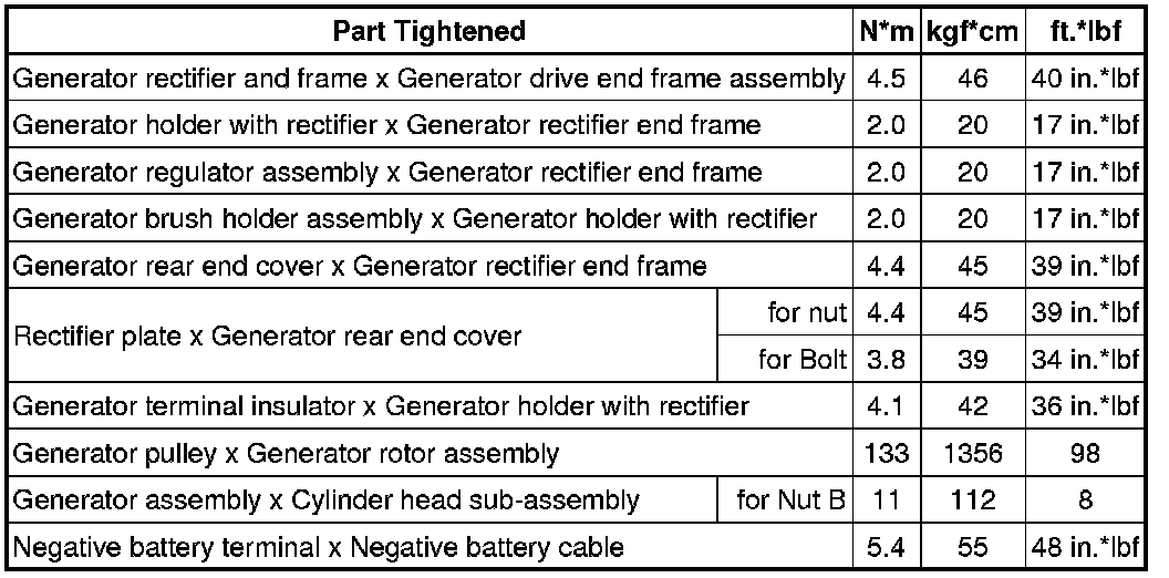 SPECIFICATIONS: 1NZ-FE BATTERY / CHARGING (for Sedan): TORQUE SPECIFICATIONS