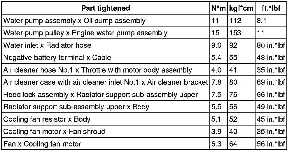 SPECIFICATIONS: 1NZ-FE COOLING (for Sedan): TORQUE SPECIFICATIONS